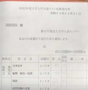 さて本日、共通テストの結果が届きました。